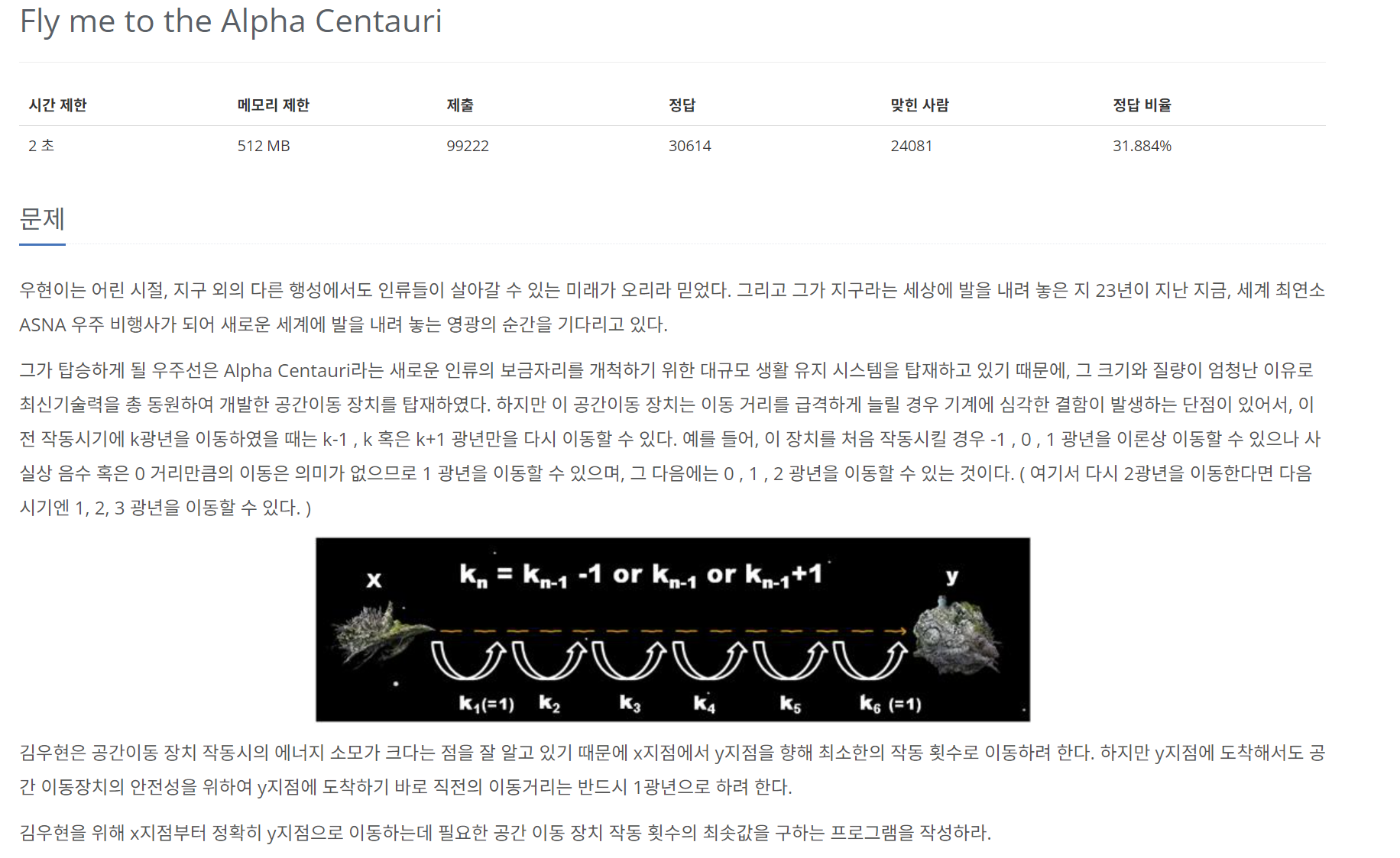 https://www.acmicpc.net/problem/1011 문제 설명 k광년을 이동하였을 때는 k-1 , k 혹은 k+1 광년만을 다시 이동할 수 있다. 예를 들어, 이 장치를 처음 작동시킬 경우 -1 , 0 , 1 광년을 이론상 이동할 수 있으나 사실상 음수 혹은 0 거리만큼의 이동은 의미가 없으므로 1 광년을 이동할 수 있으며, 그 다음에는 0 , 1 , 2 광년을 이동할 수 있는 것이다. ( 여기서 다시 2광년을 이동한다면 다음 시기엔 1, 2, 3 광년을 이동할 수 있다. ) x지점에서 y지점을 향해 최소한의 작동 횟수로 이동하려 한다. 하지만 y지점에 도착해서도 공간 이동장치의 안전성을 위하여 y지점에 도착하기 바로 직전의 이동거리는 반드시 1광년으로 하려 한다.김우현을 위해 x..